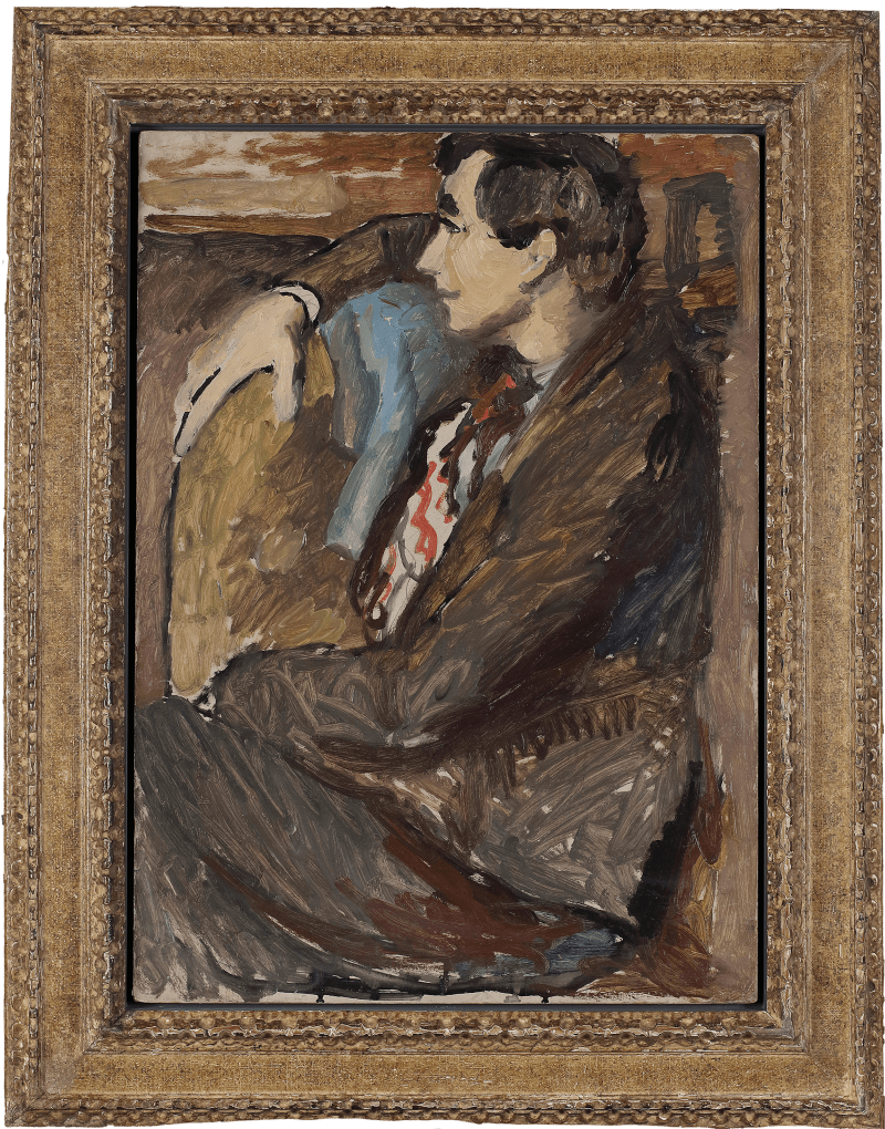 | This boldly modernist portrait by Duncan Grant depicts his close friend and physician Dr Marie Moralt, a little-known but central figure in the lives of Duncan Grant and Vanessa Bell (1879-1961). For approximately the past generation (since it was bought and owned by the leading Charlstonian art historian, Richard Shone) the portrait was inexplicably folded over on its edges, disguising not only its signature, but major portions of the composition such as the expressively clasped hands, and ‘integral’ painted frame or slip. Whilst their experience of the First World War was relatively free of trauma, the end of the war brought a period of change and instability for the couple. On the first Christmas of peace, Bell gave birth to their daughter Angelica (1918-2012). When the child took a dramatic downturn in health, the local doctor administered medicine which worsened Angelica’s condition, blaming Bell’s milk. After consulting several doctors, Moralt installed herself at Charleston, believing the doctor to be poisoning the child with carbolic. Discriminated against as a woman in the profession, Moralt had to fight to override the local doctor and eventually Angelica fully recovered. In a touching display of appreciation, Moralt was invited back to Charleston in May 1919 where she sat to both Grant and Bell who painted her simultaneously during the same sitting. Bell’s portrait of Moralt is now in the collection at The Fitzwilliam Museum, Cambridge and shows her face-on against a plain background. Grant was clearly sitting to the right side of Bell and in the background of the present work we catch glimpses of the interior at Charleston. Bell later described to her friend and fellow artist Roger Fry (1866-1934) how Moralt was ‘simply wonderful to paint,’ and their friendship endured for many years. Moralt frequently returned to Charlston, most notably in July 1919 not only to vaccinate Angelica but also embroider one of Grant’s designs. It seems that this brazen doctor became an unlikely creative assistant to Grant and her portrait identifies Moralt as a fascinating part of the group’s history Duncan Grant was one of the principal figures in the Bloomsbury Group, a set of writers, artists and intellectuals based in London. Often overshadowed by their unconventional and bohemian lifestyle, the group’s artistic contribution was central to the overhaul of Victorian rigidity and paved the way for modern British art. Born in Scotland and brought up in India, Grant set up his own studio in Fitzroy Square in 1910, having followed the advice of French painter Simon Bussy (1870-1954) to take up painting. In 1913, artist and influential art critic, Roger Fry, founded the Omega Workshops and invited Vanessa Bell and Grant to be creative directors. The Omega Workshops were an experimental design collective, aiming to dissolve the barrier between the fine and decorative arts, bringing them together through boldly patterned rugs, linen, furniture and ceramics. Despite Grant’s sexual inclination towards men, his most defining and long-lasting relationship was with Bell. When conscription was introduced in March 1916, Bell rented Charleston Farmhouse so that Grant and his lover, David Garnett (1892-1981), could work there as farm labourers. Charleston became a hub for the Bloomsbury Group, allowing a stream of fellow intellectuals and artists relative seclusion to produce radical art and ideas. |