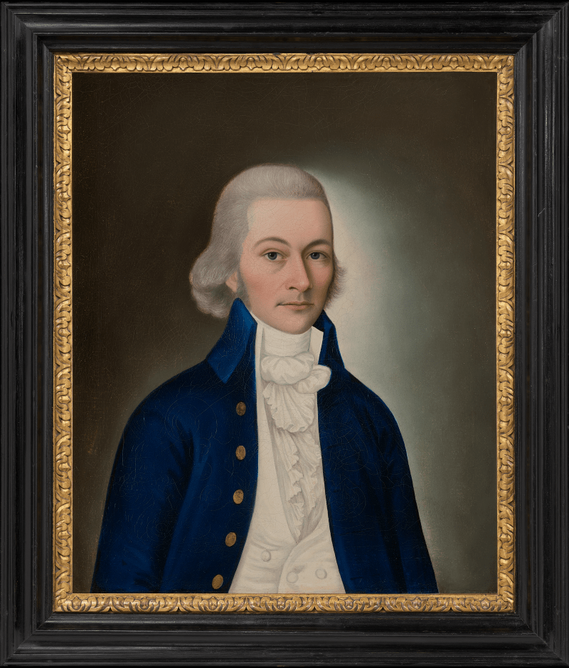 Although many works by Spoilum have survived, very little is known about the artist.[5] His earliest recorded work is a portrait of a man, probably Captain Thomas Fry, painted on glass and dated 1774 (fig.5).[6] This indicates that he was certainly active by the early 1770s and, in all likelihood, started his career as a reverse glass painter before adopting the medium of oils on canvas the following decade. Reverse glass painting was a thriving trade in Canton during this period, with numerous workshops producing copies of European prints on glass for the Western market. An oval portrait in oils, inscribed on the reverse ‘Spoilum/pinxt./Canton/Decr. 1st 1786’, is a touchstone work in the artist’s oeuvre and is more typical of the style of portraiture we now associate with his hand (fig.6). The oval format was evidently one favoured by Spoilum for his western sitters, and numerous examples of this type survive.[7] By this date, his style is distinctive, with his sitters' features drawn in a crisp, sharp manner.[8] That Spoilum continued to work on glass is suggested by the existence of unusual work depicting a man named George Harrison with fellow crew members from the ship Alliance, which bears a label on the reverse: ‘G. Harrisons’ – has’d of Spoilum in Canton, AD 1788.’[9] The composition derives from a print by Henry Banbury and was presumably commissioned by Harrison, who was the supercargo aboard the Alliance in 1788.[10]
