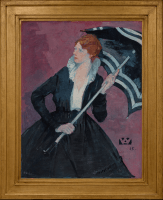 Born in Belgium, Esther Konstam moved to England as a child when her father entered the Stock Exchange just in time for the Gold Boom.[1] In England, she married Alfred Kohnstamm (1873 - 1944), who had emigrated from Germany and established a successful leather business with his brother. The Kohnstamm family became great friends and patrons of Wolmark – Wolmark became a frequent visitor to the Konstam home, known as ‘Wally’ to Esther’s children.[2] Esther was described by her children as ‘always beautifully dressed’, [3] with her hair ‘piled on top of her head’.[4] Here, she is captured with theatrical poise, holding a striped parasol against a richly textured magenta backdrop, dressed in a sweeping black gown with a sharply ruffled collar. She dominates the composition, embodying the modern values shared between artist and sitter.