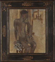 This work, which was exhibited widely during and after Philpot’s lifetime, belongs to a group of paintings made during the final decade of Philpot’s career. In 1936 and 1937, Philpot painted several full-length and three-quarter-length depictions of Thomas, which frequently personify him in performative roles [if we have room in details sheet let's illustrate some e.g. The Harlequin]. The present work was almost certainly painted from life and is less staged and more naturalistic by comparison. Thomas is depicted in Philpot’s studio beside a neat stack of canvases leaning against an easel on the right-hand side of the picture. The attitude of his body is relaxed but not entirely natural; the carefully arranged posture suggests both intimacy and performance, a balance that reflects Philpot’s broader treatment of the male nude at this date.