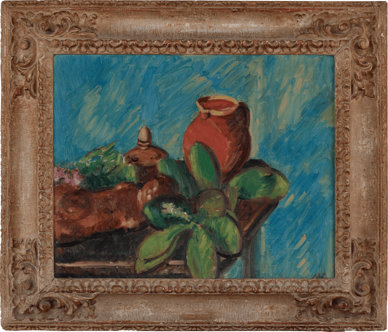 Gertler suffered from tuberculosis and after the First World War spent long periods of time in France where the climate was more forgiving. By the time this work was painted, Gertler had familiarised himself with contemporary French art and was continuing to experiment with post-Impressionist concepts of colour in relation to form and space. Although avoiding highly pitched tones in this work, the artist nevertheless demonstrates his assimilation of knowledge as to how certain objects of a similar tonal value can exist beside and complement each other in a composition. This effect is heightened by the artist’s smooth style of painting which softens the surface texture of each object – whether it be a piece of fabric or a clay pot – and creates a more visually harmonious work.