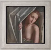 This sitter appears across multiple works of this period, including Virginal (c.1928–29), Summer Bed Time (c.1929), and later head studies such as The Pearl Necklace (c.1932-41). Such repetition is characteristic of Procter’s practice during these years: she returned to a chosen model over sustained campaigns, refining pose and mood. The present work stages the figure within a private, curtained composition. Drawn aside by the sitter’s hand, heavy drapery creates a shallow, theatrical space. Procter’s treatment of flesh is cool and silvery, built up through densely worked, subtly modulated layers of paint – a manner for which she became well known – creating a weighty, sculptural presence that...
