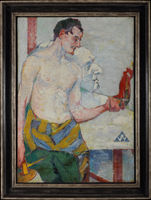 This ground-breaking portrait by Alfred Wolmark is the first of two oil portraits of Henri Gaudier-Brzeska by Wolmark, and the only one in private hands.[1] It was given by the artist to Gaudier-Brzeska as a gift in return for a larger than life-size bust of Wolmark by Gaudier-Brzeska, depicted in the background of this work [figs. 1 and 2].