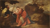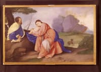 The subject of this lyrical work is the New Testament story of the Flight into Egypt. Joseph is warned in a dream that King Herod is seeking the infant Jesus with the intent of causing him harm and thus flees with Mary and Jesus to safety in Egypt. As was often the case with ‘cabinet’ miniatures, this work reproduces (and in areas reinterprets) a celebrated Old Master painting – in this instance a now-lost work by Titian (1488-1576), a copy of which is now in the collection at Longleat House. Although Oliver appears to have faithfully reproduced the composition in general, on closer inspection one notices idiosyncratic flourishes of imagination that only a highly talented and confident artist would dare include. The structure on the far rocky mound, for...