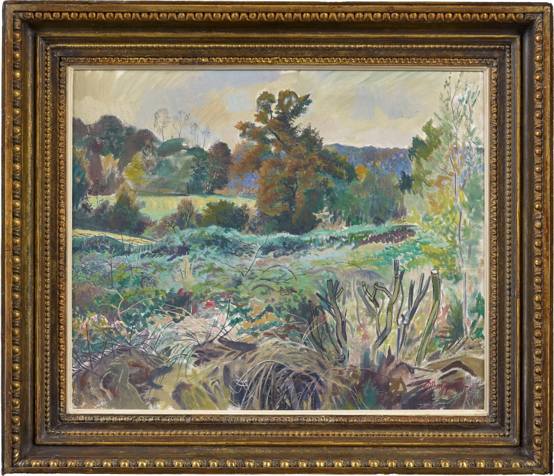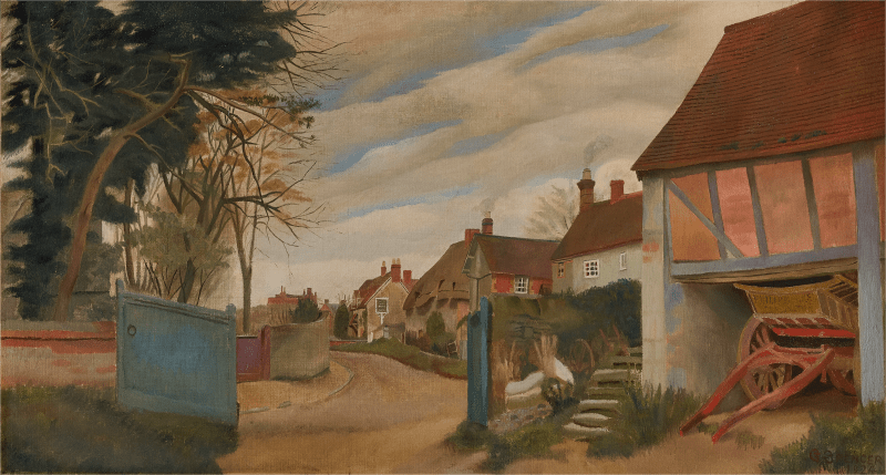 An Oxfordshire connection is present in this autumnal landscape. The painting depicts a young girl, as yet unidentified, walking along a path in Garsington, Oxfordshire. Garsington Manor, near Oxford, was the home of the audacious society hostess and patron of the arts Lady Ottoline Morrell. She helped Spencer settle into the village of Garsington and played a critical role in introducing Spencer to the likeminded, artistic individuals who frequently visited her house. Visitors to the old Oxfordshire manor house at Garsington were so welcomed by the owners, Ottoline and Philip Morrell, that some would stay for months on end. Artists, writers, poets and creatives such as W. J. Turner, T. S. Eliot, D. H. Lawrence, Aldous Huxley, William Butler Yeats, Virginia Wolf, Vanessa Bell, Lytton Strachey, Duncan Grant, David Garnett, Dora Carrington, Dorothy Brett, Ethel Sands and Siegfried Sassoon frequented Ottoline’s Oxfordshire home. In her memoir, Morrell described her home as ‘a theatre, where week after week a travelling company would arrive and play their parts ... How much they felt and saw of the beauty of the setting I never knew.’