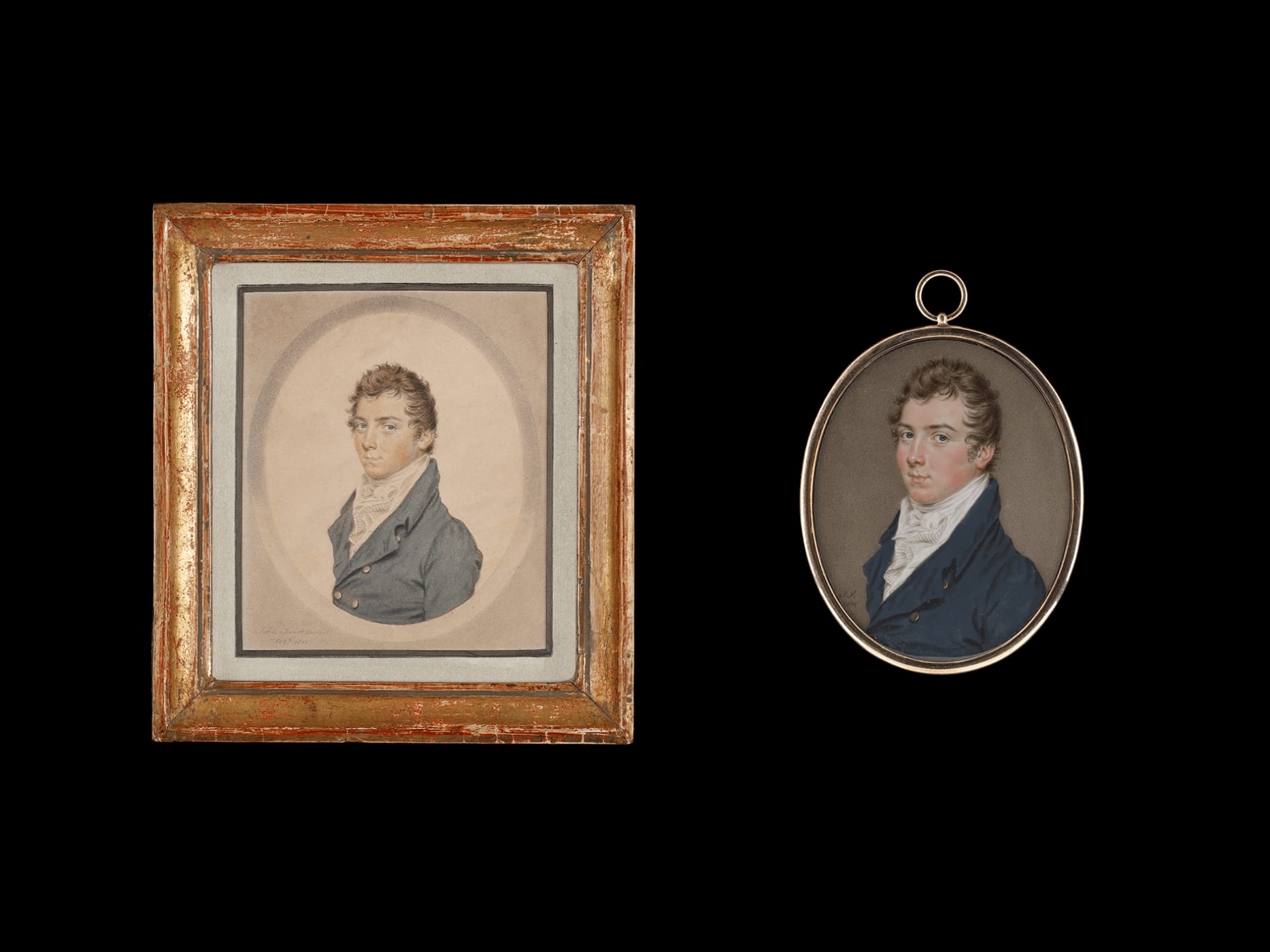 Drawing served as the foundation upon which Smart built his artistic expertise and, at the outset of his career, he established a robust routine that differed from his fellow miniaturists. Smart produced highly detailed sketches of his sitters as a preliminary stage in painting their portraits, which he then used to work up his final portrait miniatures. These drawings were retained by the artist, functioning as a comprehensive visual record of his output and aiding the production of further versions if ever required. They were pasted into large albums and were often inscribed on the reverse with colour notes and the sitter’s name.
