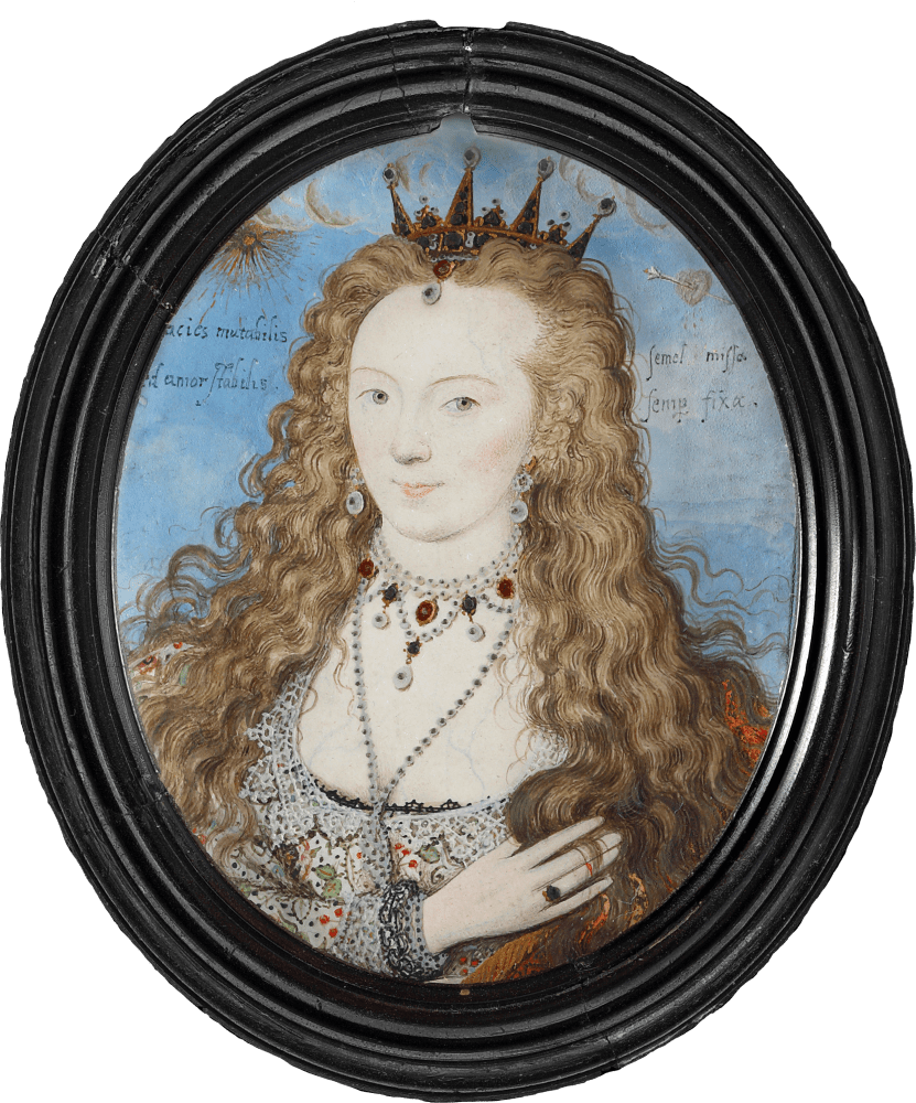 Hilliard’s sitter is portrayed with long, flowing hair: an indication either that she was unmarried at the time this likeness was created or, if married, that she has been portrayed in masquing attire. The latter seems the more likely scenario, particularly if the traditional identification of the sitter is accepted: Elizabeth Stanley was married at the age of about fourteen and the lady portrayed here looks to be slightly older, perhaps in her late teens. The sitter’s headwear, like her loose hair, is also evocative of the world of the late Elizabethan and early Jacobean court entertainment. What Hilliard has depicted here is probably either an ‘attire’ or a ‘circlet’, examples of which are recorded in the inventories of Anne of Denmark, the greatest patron of the early Stuart court masque.