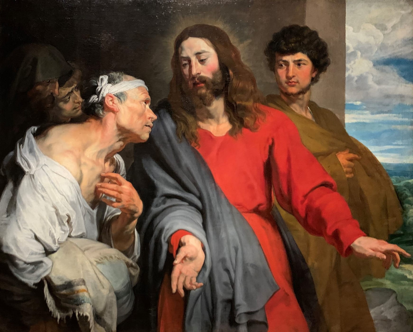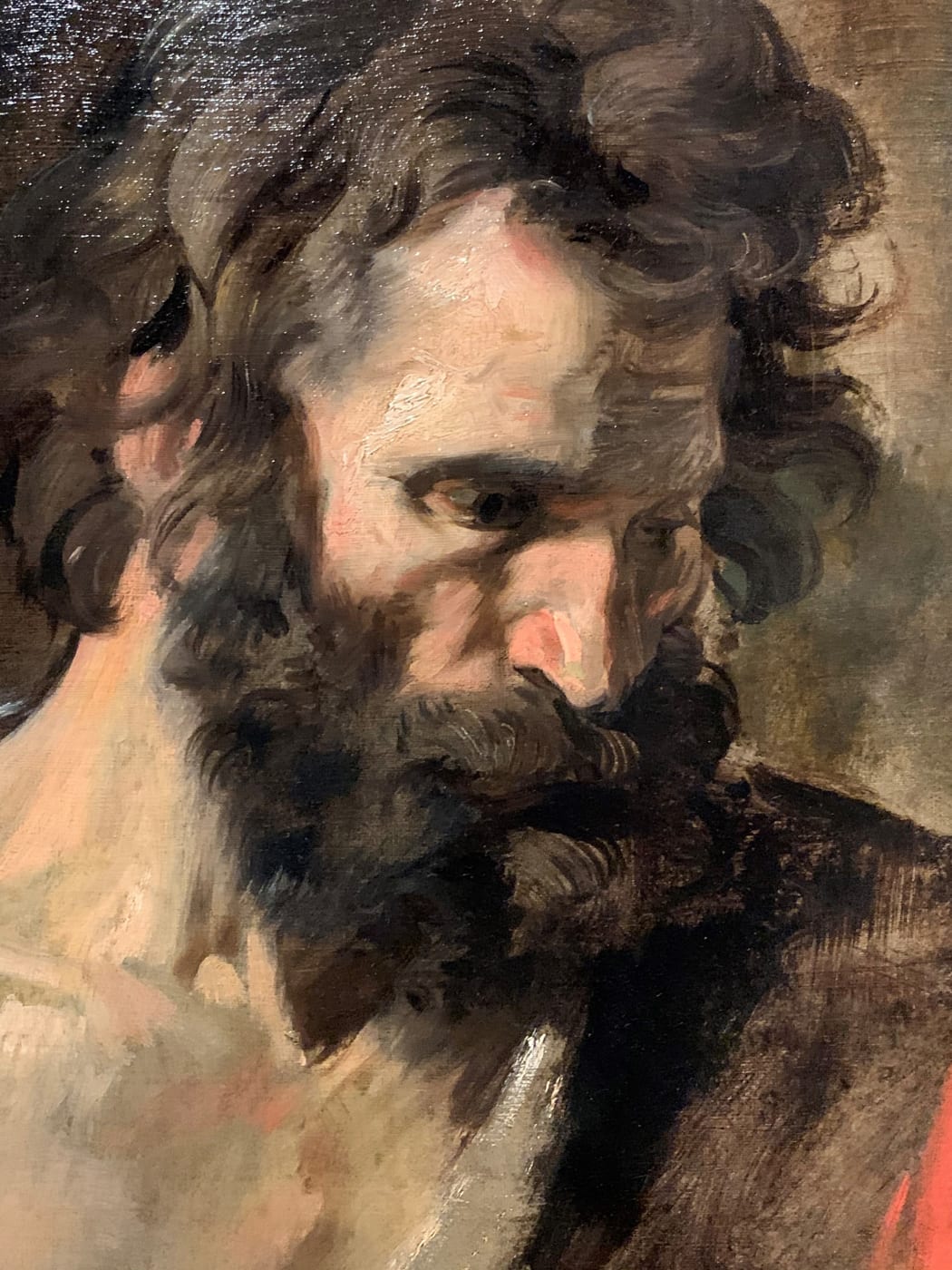 In this first room visitors were introduced to several early large-scale works including Drunken Silenus (c.1617/18) (fig.1) which was compared to Rubens' painting of the same subject hanging nearby, and two versions of Christ Healing the Paralytic (c.1618-20) (fig.2). Several compositional studies on paper for the latter work were also on display (fig.3) along with a head-study in oils relating to the background figure to the right of Christ (fig.4). Although I am very familiar with Van Dyck's work, having researched and catalogued many examples here at the gallery, it was a great privilege to be able to compare finished compositions with the preparatory studies 'in the flesh'.