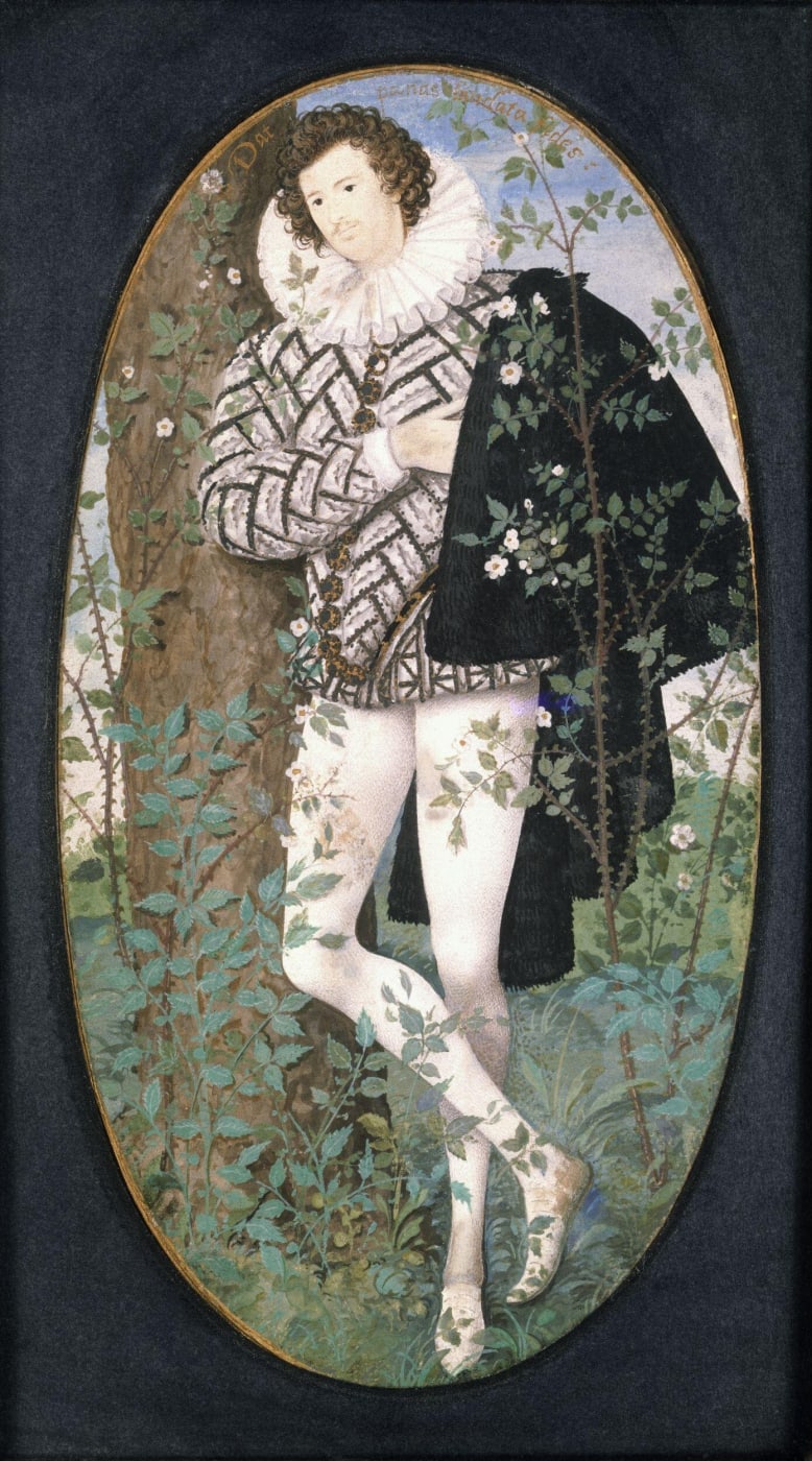 But no matter how hard he worked for his royal patron, Hilliard was never well paid by Elizabeth. The Queen and her ministers continually made promises of remuneration that they were not actually obliged to realise. And, around the end of the 1580s, Hilliard began to face competition. His erstwhile pupil, Isaac[5] Oliver had begun to work as an independent miniaturist in his own right, and his talent - on par to that of Hilliard - stood to lose Hilliard private commissions. Likely in response, Hilliard developed the "cabinet miniature" format, which showed his sitters at full length and occupying naturalistic spaces; an example of these works is the famed 'Young Man among Roses' (Fig. 4).