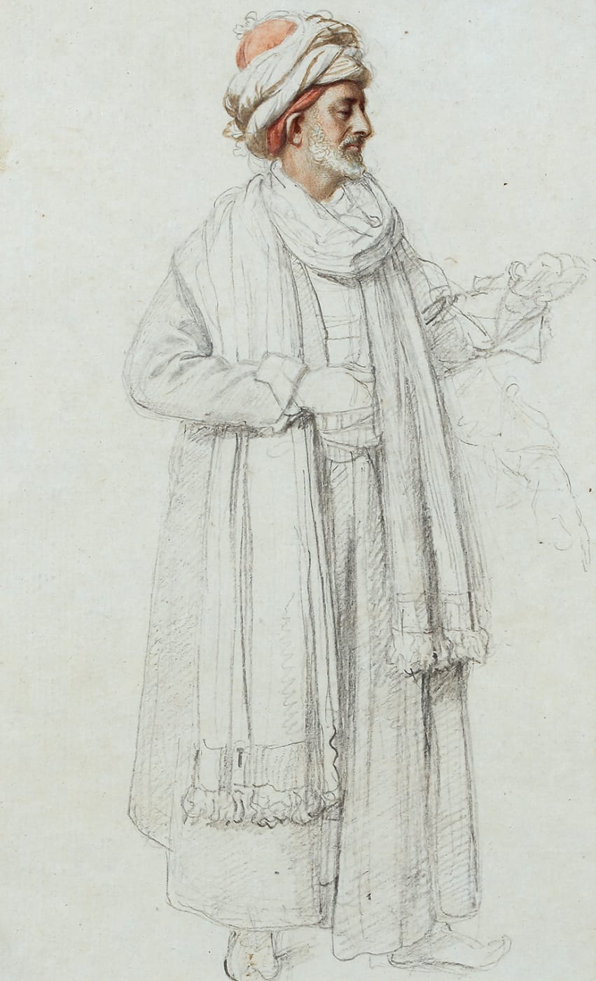 Initially, without a name for the sitter in this intriguing drawing, we looked closely at his costume for clues. The attire of the gentleman identified him as a scholar or high-ranking secretary in North Africa:[3]