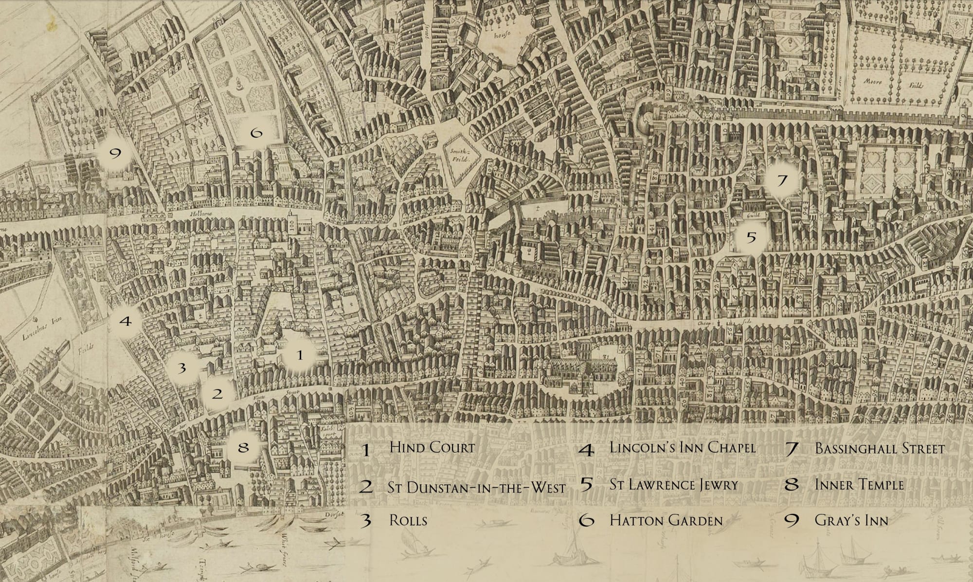 Close family members were not far away either. Aside from the Woodfordes, who sometimes lived at Hind Court, the Smith cousins were just a few minutes away at Temple, Charles’s older brother lived in Hatton Garden, and Samuel Woodforde’s sister on Bassinghall Street – on the way to the Royal Society in Broad Street.