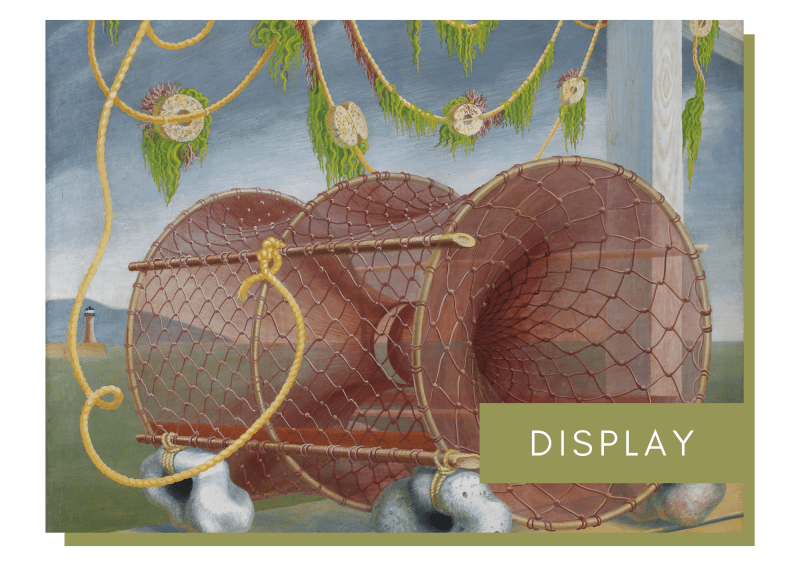 During the wartime and post-war years, Eileen Mayo embraced the traditional technique of egg tempera painting, a method that uses egg yolk as a binder for pigments. Very few artists were using tempera at this date; not only was it a more difficult medium to master compared to oil paint but, crucially, eggs were scarce throughout the 1940s due to rationing. Undeterred, Mayo used her family’s egg ration to create her works, including the notable Lobster Pot.